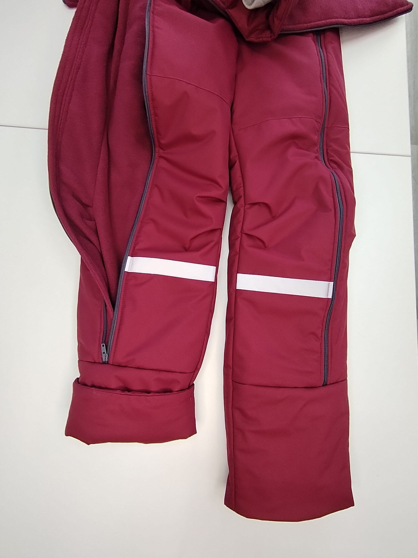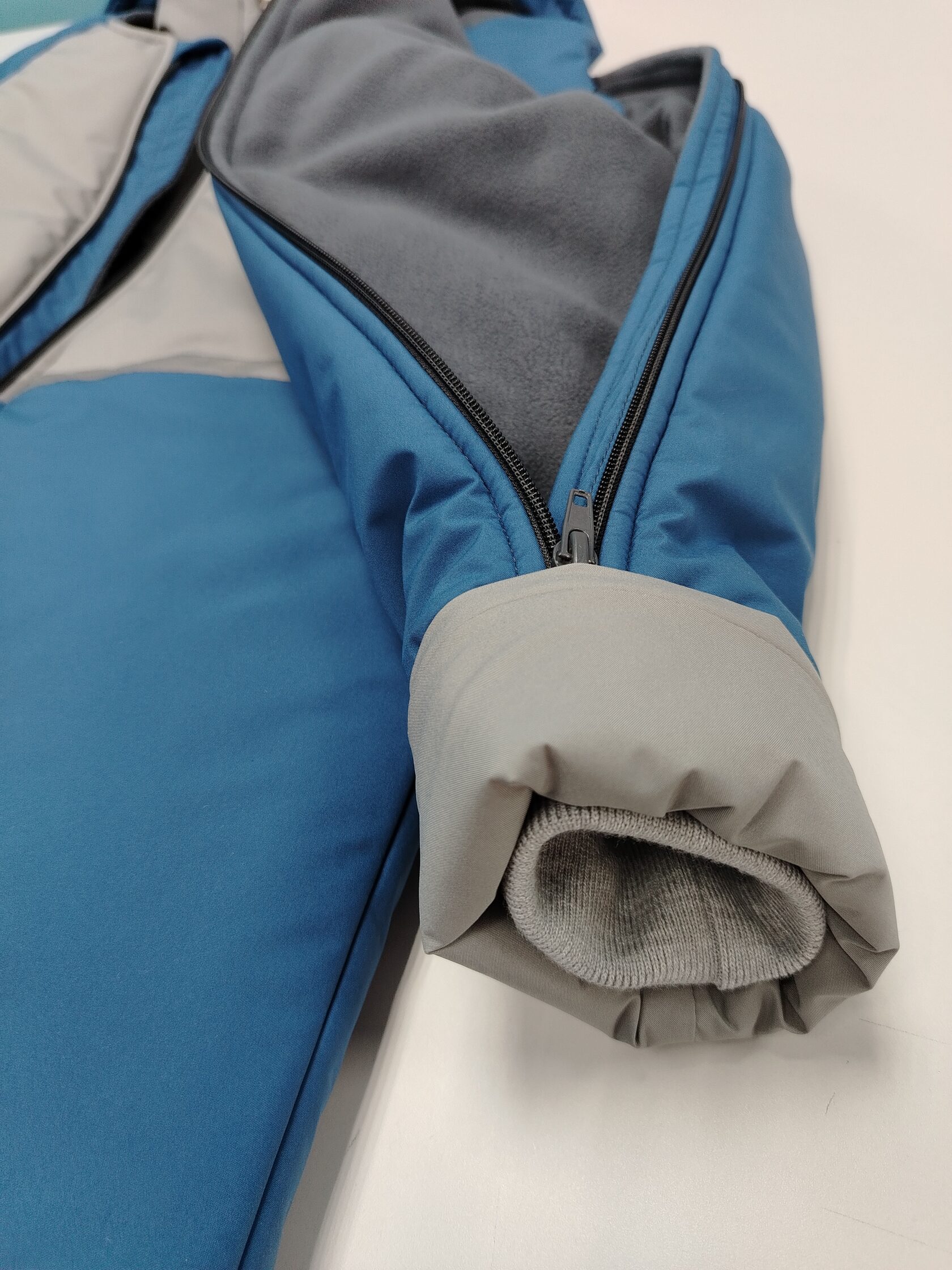 Для удобства одевания комбинезона на передней части есть две молнии до низа штанин. При необходимости молнии устанавливаются на рукава. Такой вариант позволяет с легкостью одеть и снять верхнюю одежду, исключив дискомфорт как для ребенка, так и для родителей. Зона шеи и плеч прикрывается манишкой. Капюшон фиксируется на молнию или может быть не съёмным. Период использования – весна, осень, зима. Материал верха – Мембрана Материал подкладки 1 вариант – поливискоза (вискоза 50%, полиэстер 50%) Материал подкладки 2 вариант – флис (полиэстер 100%) Материал утеплителя – Альполюкс (95% полиэстер 5% шерсть) плотность зависит от сезонного назначения.